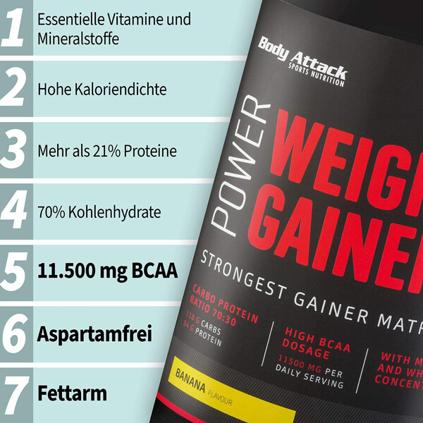| Performers need muscles. And muscles need our Power Weight Gainer. At least that is what we say. Undoubtedly, the turbo blend of complex carbohydrates, proteins and a high dosage of BCAA provides the excess calories you need to | build muscle mass. For maximum power, more than 70% of carbohydrates are in our best Gainer. The energy that is worth seeing. Low in fat. Aspartame free. Excellent digestible. So simply you train at the limit and come into the mass. Hands-on it. |