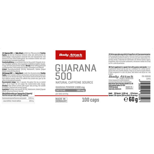 The extract of Guarana contains, inter alia, about 12% tannins, up to 6% caffeine and 4% minerals. The taste of the pure powder is very bitter and astringent. Therefore, it is most commonly used as an additive to other foods. The caffeine of Guarana is similar to caffeine in regular coffee. Guarana 500 of Body Attack is a good alternative for people and athletes who like refreshing and invigorating tea and caffeine.
