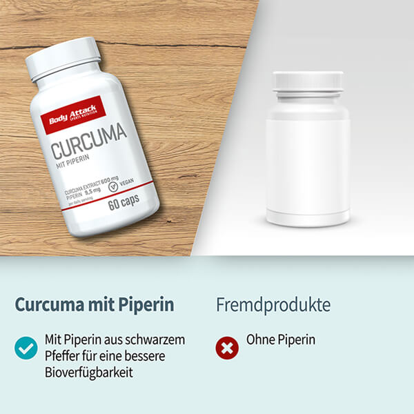 Do you rely on plant power? We also! Here come the strong turmeric capsules with piperine from black pepper! Say “Hello” to your very own fat digestive system. Everything is purely vegetable, of course. Benefit from the effects of the turmeric plant in our capsules with high-quality extract. With a dosage of 600mg per daily portion (2 capsules), you are ideally supplied. Feeling full or