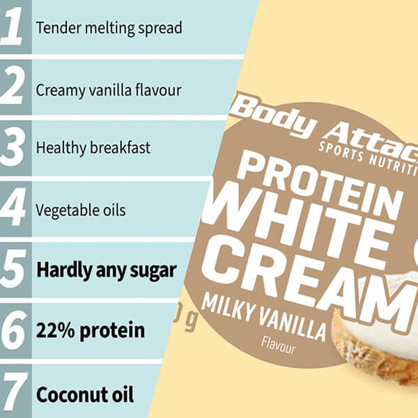 | Creamy vanilla taste, high-quality whey protein, hardly any sugar. The star of the sweet spread heaven is called Protein White Cream. All other spreads can simply give up. Our white cream contains only 0.3 g of sugar per portion. We process 22% protein from high-quality whey protein concentrate, vegetable | oils and the best vanilla flavour into a smooth and melting spread. If the day ends with shameless cream spooning on the sofa, then please without a guilty conscience and with the best white protein cream. Our Protein White Cream. |